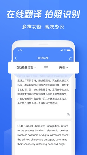 1、可批量识别图片文件或即时拍照识别各种文件、图片、书籍等,即识即译,高效迅速;