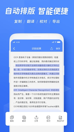 1、智能识别后的文字可进行自由编辑、复制、翻译、校对、重新识别、一键复制分享导出等,自由管理,方便省心;